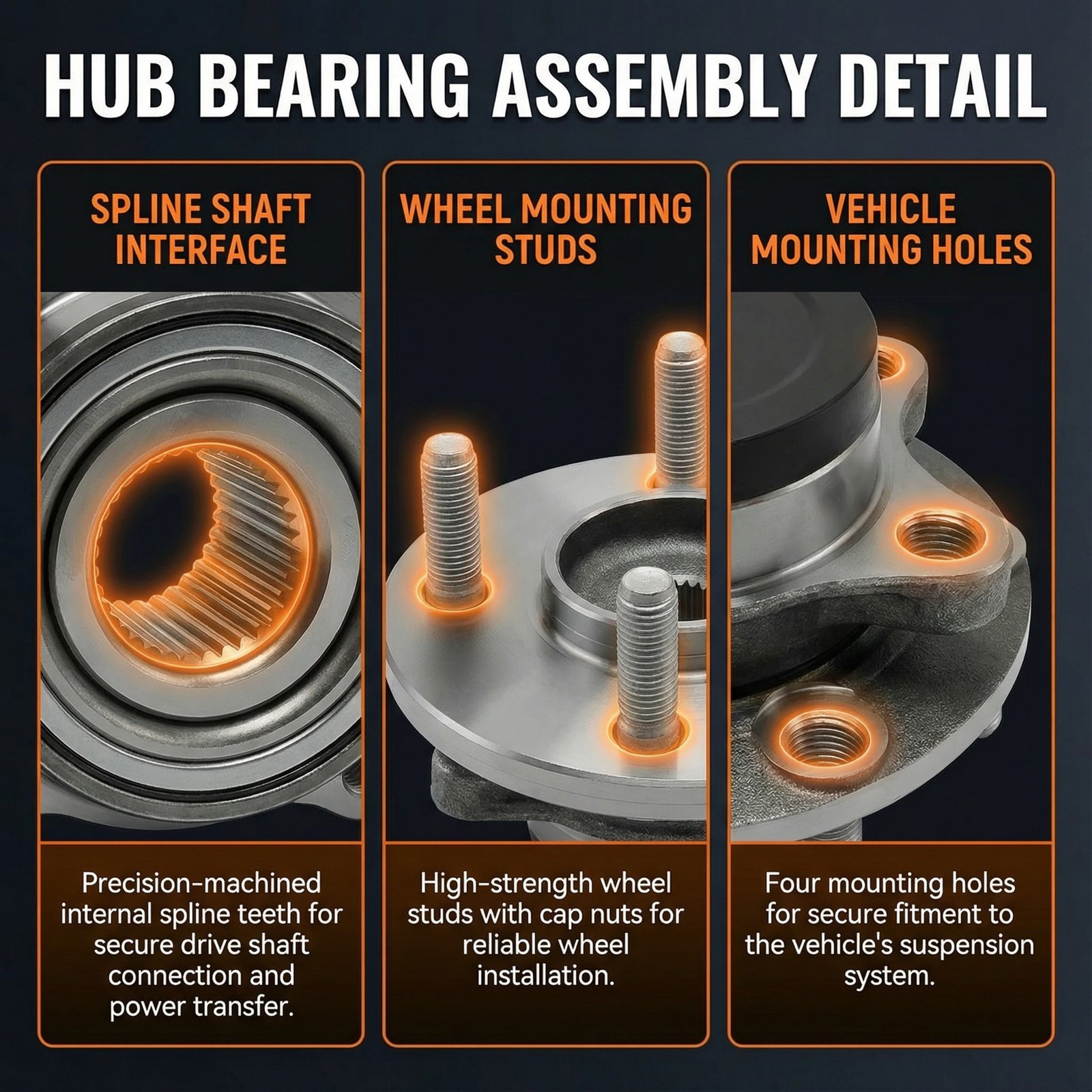 Bearing End Face Details: The center is a precision internal spline shaft hole, used to fit with the vehicle half-shaft, ensuring stable power transmission without jitter or abnormal noise even under heavy load. The bearing outer ring is designed to match the original vehicle steering knuckle, ensuring no gap after assembly and strong stability.