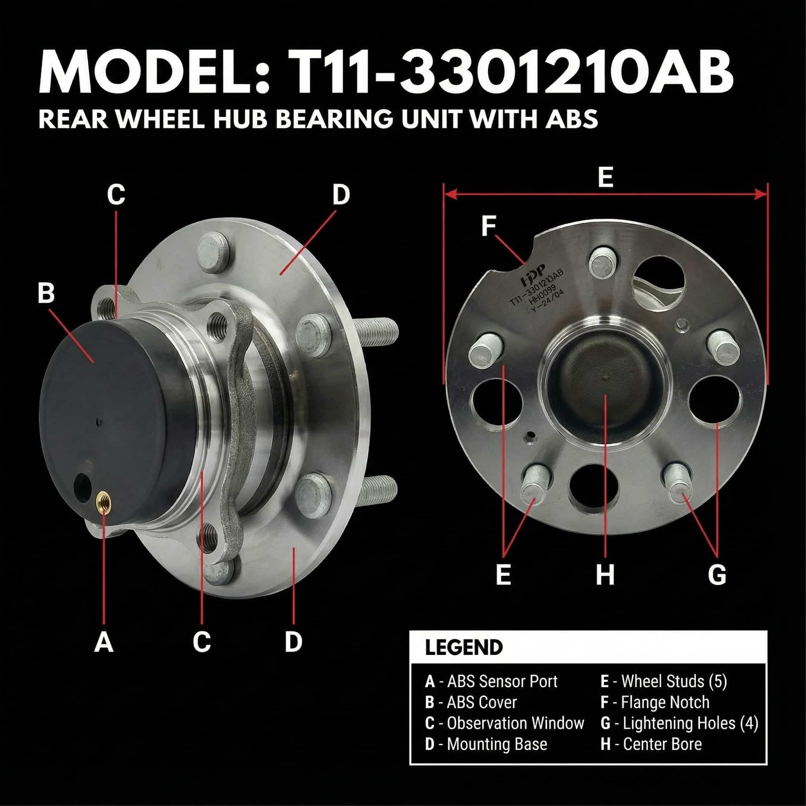 - Hub Flange Surface: Finished with precision concentric machining for a bright metallic appearance. Laser‑marked with brand (HJDP), OE number (T11‑3301210AB), and part number (HH0099) for easy traceability and authentication.